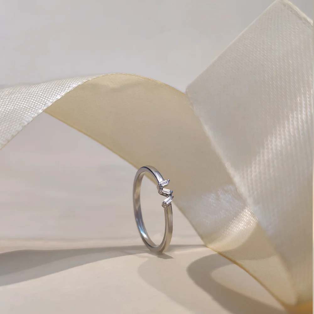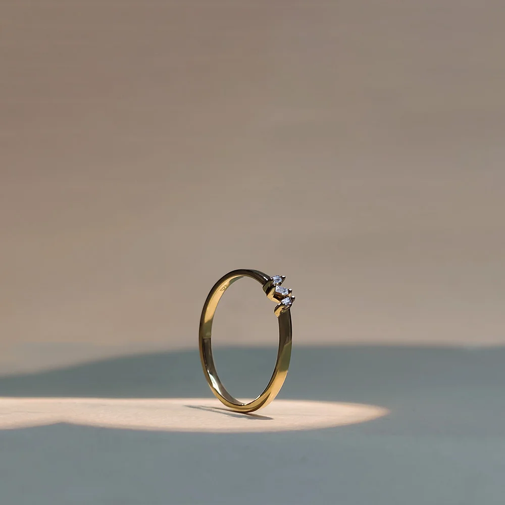A delicate band set with three cubic zircons in quiet balance, offering a restrained sparkle that feels light, thoughtful and easy to wear every day.