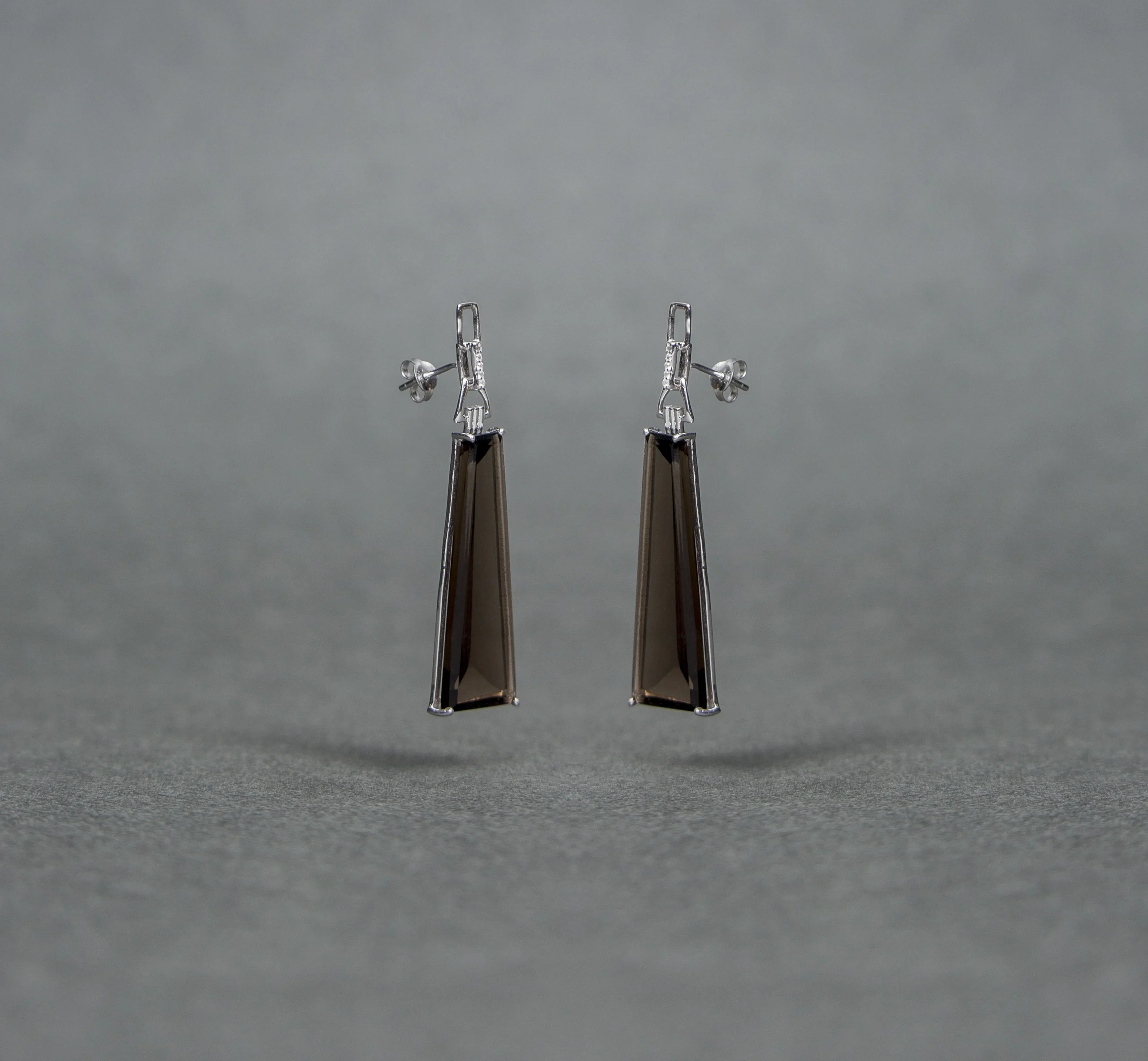 Each earring is adorned with a Natural Smoky Quartz Gemstone, The faceted cut enhances the stone’s natural translucence, creating a mesmerizing play of light.