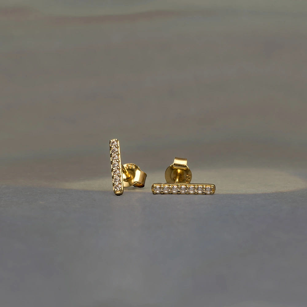 A slender bar set with cubic zircons in a clean row, offering a quiet line of sparkle that feels neat, modern and easy to wear.